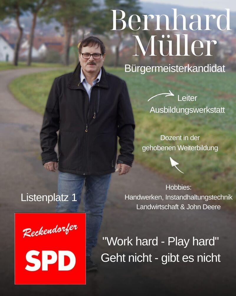 Bernhard Müller ist unser Bürgermeisterkandidat für Reckendorf. Er führt unsere Gemeinderatsliste an und kandidiert auf der SPD Liste auch für den Kreitag auf Platz 30.